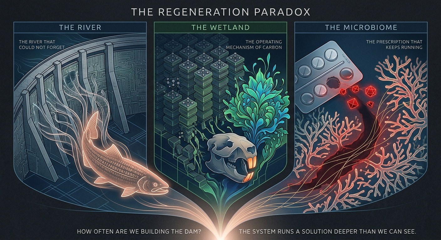 The salmon knew where to go when the dams were still in place. They just couldn’t get there. The beaver knew how to build carbon infrastructure. Europe just didn’t know it had been building it. The gut microbiome knew how to regulate itself across timescales medicine hadn’t yet thought to measure.